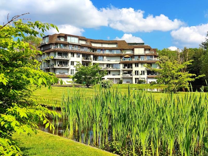 Met het zicht op de groene, waterrijke oase als baken van rust waarvoor dit Domein De Steelander geroemd is, voelde thuiskomen in dit luxueus afgewerkte appartement nog nooit zo goed aan. Bij het opdraaien van het domein word je overweldigd door een rustgevend luxegevoel. Dé troef? Vanuit de leefruimte geniet je van een subliem zicht op de vijverpartijen in de feërieke parktuin en dat zonder inkijk. Het pand is doorspekt met hoogwaardig vervaardigde inbouwkasten op maat, incl. ingemaakte verlichting. Via de privatieve inkomhal bereik je de zonnige leefruimte met semi-open keuken (natuurstenen werkbladen, vaatwas, inductiekookplaat, oven, microgolf, ...) met aangrenzend de berg- en wasruimte. Op het terras waan je je als God in Frankrijk. Kleinkinderen spelen er naar hartelust, zonder je te hoeven verplaatsen. Via de nachthal met nachttoilet en op maat gemaakte dressing, kom je aan slaapkamer 1 met volledig uitgeruste badkamer (ligbad, douche, bidet en wastafel). Ook slaapkamer 2 is voorzien van een wastafel. Airconditioning is aanwezig in het appartement. Ben je niet vies van ongebreidelde luxe en topafwerking? Dan vind je hier je gading.Bijkomend is er de mogelijkheid tot aankoop van een ruime garage (prijs: 60.000 euro).